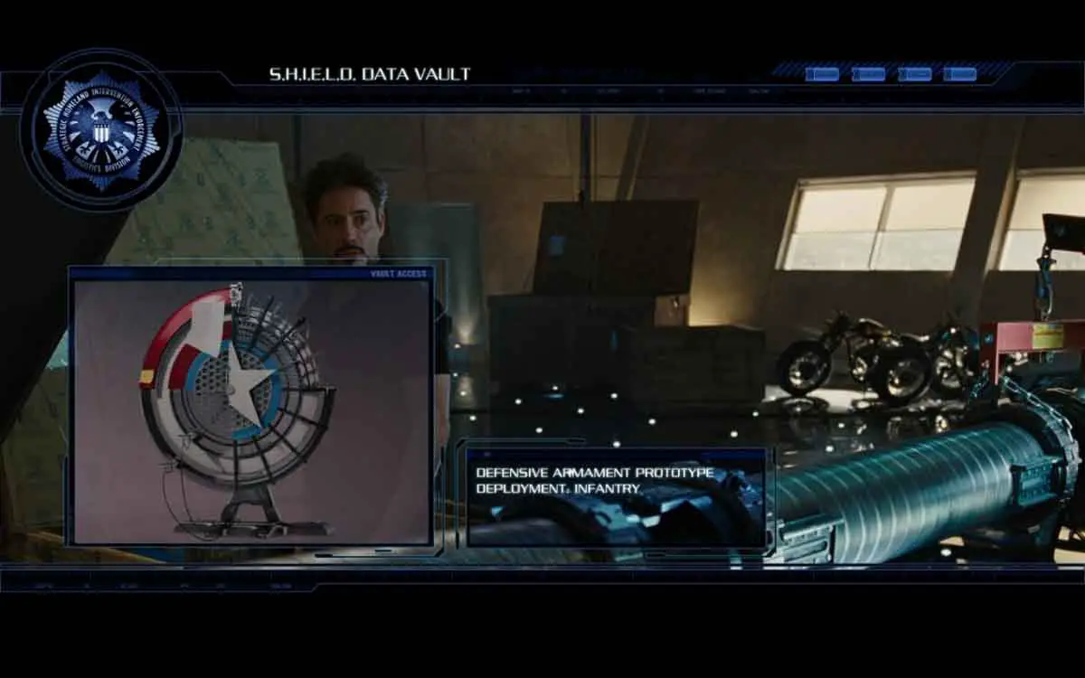 - También se muestra un prototipo del escudo del Capitán América, refiriéndose a él como Prototipo de Armamento de Defensa para un posible despliegue de infantería.