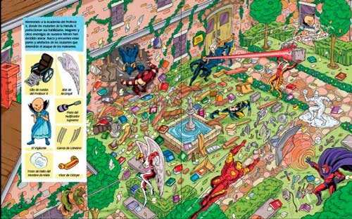 Hasta aquí un cómic a la vieja usanza. Lo que ocurre es que en la parte derecha de la página par nos encontramos con la silla de ruedas del profesor X o las alas de Arcángel o las garras de Lobezno, o el visor lanza rayos de Cíclope. El juego comienza. Debemos buscar y encontrar los iconos heroicos en una doble estampa atiborrada de personajes y objetos.