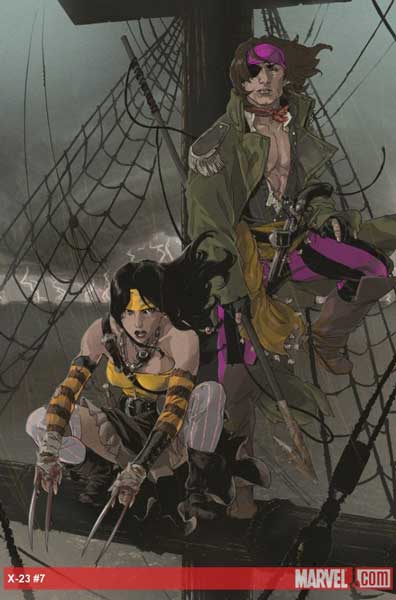 Todo lo que X-23 quiere es llegar a Madripoor, pero cuando Gambito acepta hacerle un favor a un viejo amigo, se encuentra amarrada en medio de una mortífera batalla contra una banda de piratas sin escrúpulos. A continuación os dejo la portada de X-23 Nº 7, obra de Kalman Andrasofszky.