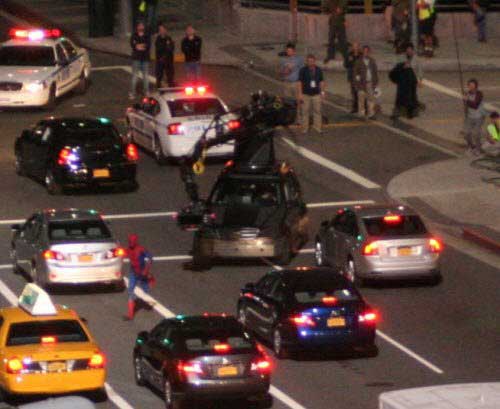 Vale, la imagen es una porquería y está tomada desde muy lejos. Además, no queda nada claro si el que corre entre los coches es el propio Andrew Garfield o un doble. Lo que sí que llama la atención es que no lleva el cinturón, y que además el color del traje parece ser más brillante, más vivo, en contraste con el traje oscuro que vimos en la imagen oficial. ¿Qué opináis?