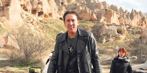 El famoso actor camina hacia su coche en un valle después de rodar en el Museo al Aire Libre de Zelve. Cage parecía exhausto y estaba cubierto de sudor y polvo. Respondiendo a la pregunta de un reportero, Cage dijo que le gustaba Cappadocia. Más tarde se dirigió al hotel en donde se hospeda con su mujer y su hijo. El rodaje de la película acaba hoy (refiriéndose a ayer día 23).