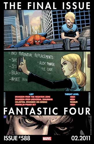 Como sabéis, el número 587 de Fantastic Four se publicó el pasado martes y trajo consigo un gran cambio para el grupo. Uno de los componentes murió, y ahora nada volverá a ser lo mismo. Con motivo de esto, y como os comenté en su momento, el próximo número, el 588, será el último de la serie. Aún no han desvelado qué ocurrirá después, pero ya están promocionando este final, que tendrá lugar el día 23 de febrero.
