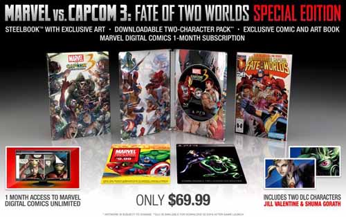 La verdad es que poco se puede añadir que no se vea ya en la imagen. El juego contenido en una caja metálica especial, un cómic de 12 páginas que sirve como prólogo al juego y que está escrito por Frank Tieri, unos diseños conceptuales, una suscripción gratuita de un mes a Marvel Digital Comics con acceso ilimitado a todo el catálogo, y los personajes descargables Shuma Gorath y Jill Valentine. Lo malo, es que esta edición especial solo se pondrá a la venta en Estados Unidos, y lo hará aun precio de 69,99 dólares (10 más que la edición normal).