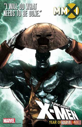 Tras los Nuevos MutantesX-Men Legado y Uncanny X-Force, turno de Uncanny X-Men en la promoción de MMXI con su eslogan «El año de los X-Men«. Aquí vemos a Coloso, que afirma que hará lo que sea necesario hacer, mientras se pone el casco de Juggernaut.