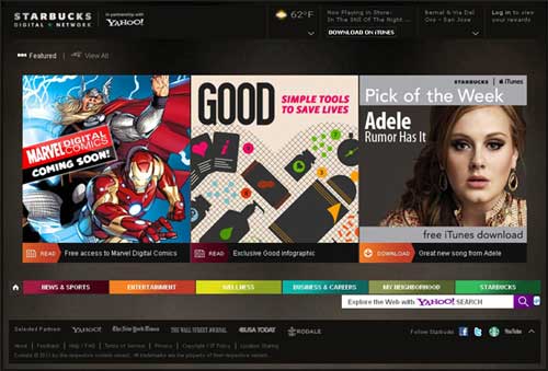 Starbucks ha anunciado hoy que, en colaboración con Yahoo!, ampliará su Starbucks Digital Network, con la que espera ofrecer a sus clientes un amplio acceso a contenido online gratuito en sus casi 6.800 establecimientos repartidos por todo Estados Unidos. Con esto, los clientes de dichos establecimientos podrán acceder a la conexión Wi-Fi gratuita que ofrece la compañía en sus locales y entrar en dicha red digital, donde podrán acceder a material como el de The Economist, Mediabistro o Marvel Digital Comics.