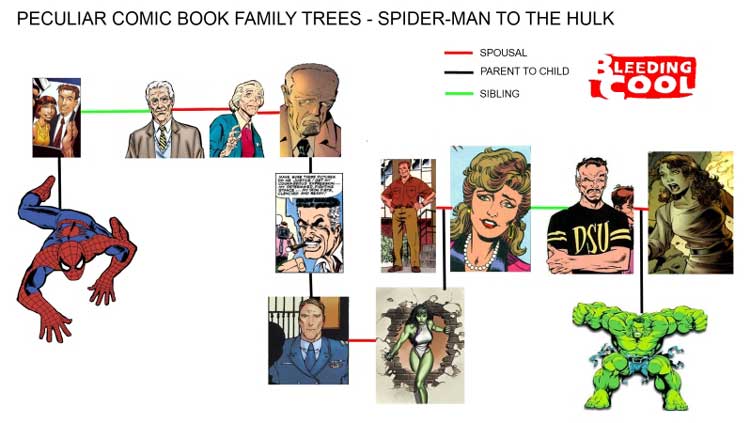 Árbol familiar que relaciona a Spiderman con Hulk Por Universo Álex - 30 marzo, 2011 FacebookTwitterPinterestWhatsAppReddItEmailTelegram Bleeding Cool ha publicado un curioso árbol familiar que relaciona en pocos pasos a dos personajes de Marvel que, aparentemente, parecen tan distantes como son Spiderman y Hulk.