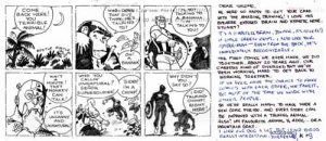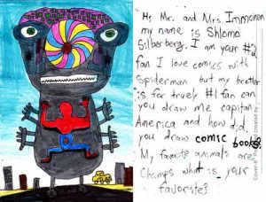 Esta es la postal que Stuart y Kathyrn Immonen le enviaron a Shlomo Silverberg, un niño que participó en una actividad de dibujo por correo, enviando dibujos como postales a dibujantes profesionales para ver qué te respondían.