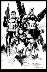 ¿Qué regala Jim Lee a unos amigos que se casan? Por Universo Álex - 10 mayo, 2011 FacebookTwitterPinterestWhatsAppReddItEmailTelegram Pues hace cinco años, Jim Lee le regaló al director artístico de Wildstorm, Larry Berry, el siguiente dibujo como regalo de boda. Sí, todo un original firmado y dedicado por Lee con Batman, Lobezno y Punisher compartiendo protagonismo. Ahí es nada.