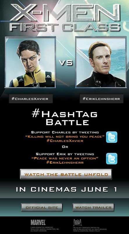 En la página oficial inglesa de Facebook de X-Men: Primera Generación han publicado un nuevo juego llamado X-Men: First Class Hashtag Battle, que ha sido desarrollado para enfrentar cara a cara a los dos principales protagonistas de la película, Charles Xavier y Magneto.