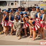 Como si de la Segunda Guerra Mundial se tratase, las encantadoras bellezas que forman en grupo de Chicas USO de la película Capitán América: El Primer Vengador han visitado a los marineros que se encontraban en Nueva York a bordo del USS Intrepid. Esta idea ya la pudimos ver cuando el estreno de Iron Man 2, así que… ¿alguien apuesta a que es una idea de Howard Stark? Obviamente, se trata de una estrategia de promoción de la película del Capi, simulando un poco el papel que desempeñarán las chicas en la propia película.