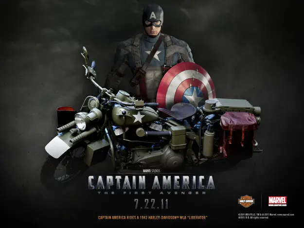 Harley Davidson se suma a la promoción de la película Capitán América: El Primer Vengador, y no sin razón. Durante la Segunda Guerra Mundial, Harley Davidson fabricó unas 90.000 motos de un modelo conocido como Liberator, que sirvió de vehículo para soldados enviados al frente, y ahora, para la película, la compañía colaboró con Marvel Studios para recrear las réplicas que podrán verse en la película.