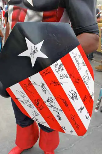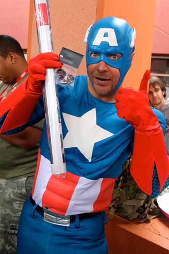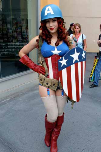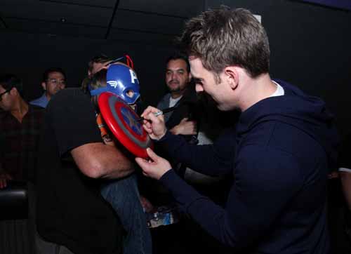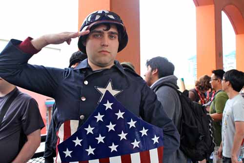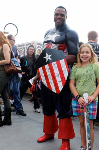 Como ya os comentamos hace unos días, ayer se proyectó en la Comic Con de San Diego la película Capitán América: El Primer Vengador, sesión a la que podía acceder todo aquel visitante del evento que se hiciese con una entrada y que fue presentada por el propio Chris Evans, acompañado de una señoritas caracterizadas de USO. Además, estaba la opción de conseguir una entrada gratis y algunos extras si eras uno de los primeros usuarios en asistir disfrazado de Capitán América, y parece que hubo participación. A continuación os dejamos algunas imágenes.