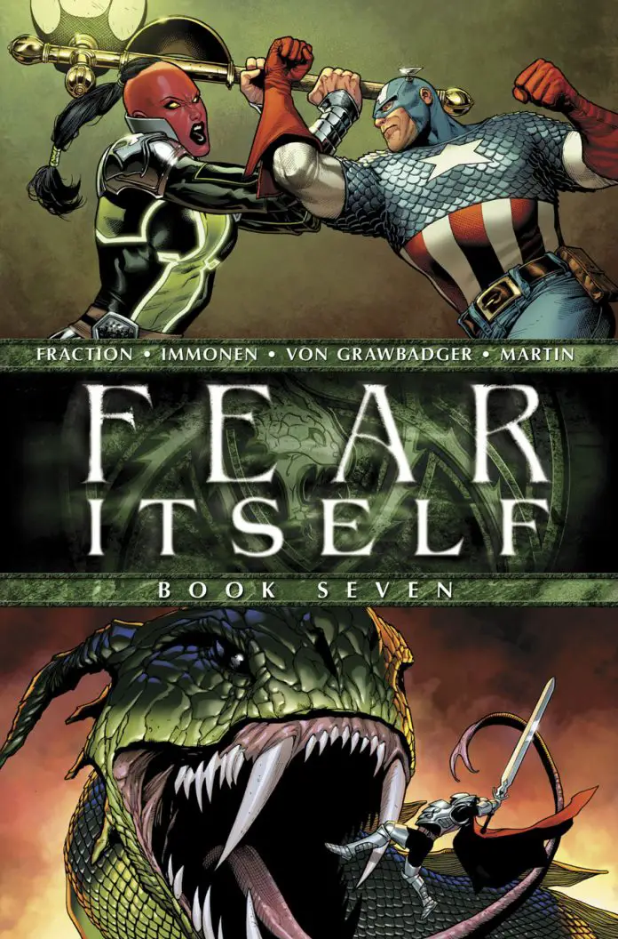 Lo primero de todo fue mostrar la portada del último número de la miniserie de Fear Itself, en la que se ve al Capitán América luchando contra el nuevo Cráneo Rojo y a alguien luchando contra una serpiente gigante, ¿será Thor?.