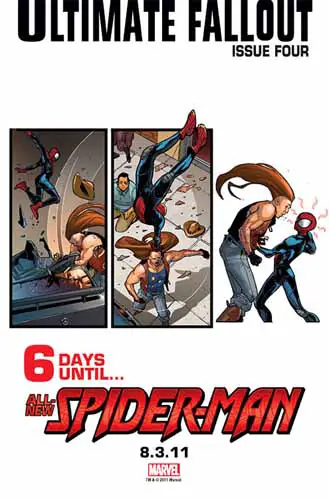 Tras el primer teaser llega el segundo, el que nos anuncia que quedan 6 días para descubrir quién es el nuevo Ultimate Spiderman en Ultimate Fallout Nº 4. En esta ocasión vemos una secuencia de acción dividida en tres viñetas que parecen continuación directa de lo que vimos en el primer teaser.