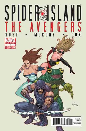 Esto parece un trabajo para el Hombre Rana. Espera, ¿en serio? Pues sí, echa un vistazo a Spider-Island: Avengers Nº 1 y verás el cruce de Los Vengadores con el evento arácnido protagonizado por Ojo de Halcón, Ms. Marvel y Jessica Jones.
