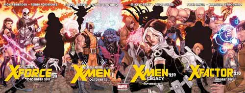 Suma y sigue. Aquí os muestro las últimas revelaciones, junto a las anteriores, del equipo amarillo, el de Lobezno. Entre todas las nuevas incorporaciones destaca la de Mariposa Mental en Uncanny X-Force, que resulta que también aparece en el bando de Cíclope, ¿acaso juega en los dos bandos? También se unen Quentin Quire y Bestia (¿quizás Bestia Oscura?) en Wolverine and the X-Men, y Siryn y Chico Fuerte en X-Factor. A continuación los tenéis todos juntitos.