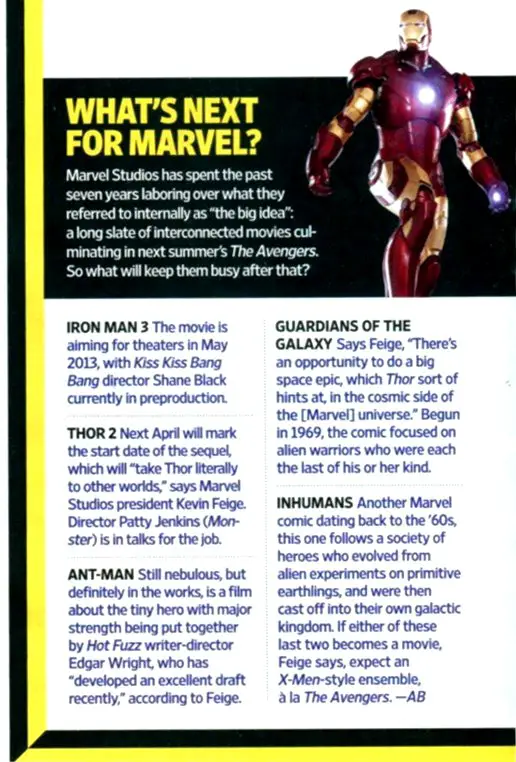 Hace unos días, hablamos de qué películas podrían llegar tras Los Vengadores, pero en un reciente artículo de EW dedicado a la película de Joss Whedon, aparece un listado de proyectos que, supuestamente, está preparando Marvel para 2012 y 2013.