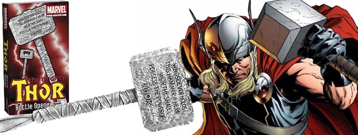 ¿Y por qué no? En el campo del merchandising nunca está todo dicho. Si eres fan de Marvel y aficionado a la bebida, y siempre tienes problemas para abrir las chapas de las botellas, Diamond Select Toys pone a tu disposición a partir de 2012 un abrebotellas basado en el famoso Mjolnir de Thor.