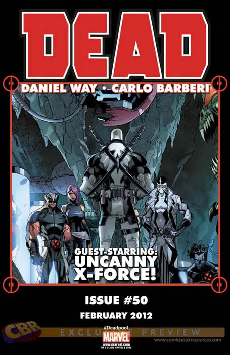Ayer os mostramos un teaser de Deadpool Nº 50, número que llegará el próximo 8 de febrero y que supone el comienzo del arco argumental Dead, escrito por Daniel Way y dibujado por Carlo Barberi. Dead cuenta con Wade Wilson persiguiendo su plan definitivo que le permitirá sentir el frío abrazo de la muerte después de una cadena de intentos fallidos en 2011, un plan que tendrá muchas consecuencias en el Universo Marvel.