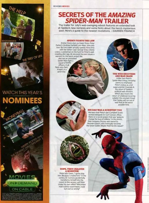 Gracias al número de febrero / marzo de la revista Entertainment Weekly, tenemos un poco más de información de la película The Amazing Spider-Man. A continuación os dejamos un escaneo que nos muestra que en realidad la información no nos desvela nada que no supiésemos ya. Se trata de un resumen de los puntos más destacables del último tráiler que se ha publicado de la película, y es cierto que también podemos ver una imagen inédita de Peter Parker con Gwen Stacy.