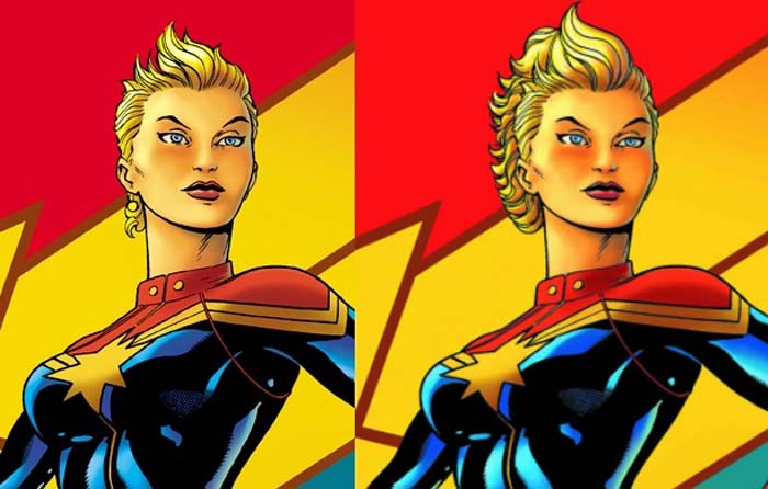 A veces ocurren cosas extrañas como la que os vamos a relatar. En DC Women Kickin Ass, se han dado cuenta de que el nuevo Capitán Marvel, o más bien la nueva Capitana Marvel, ha sufrido un ligero cambio previo a su debut. Al parecer, en tres de cada cuatro publicaciones en internet, estaba siendo criticado el nuevo aspecto de Carol Danvers, más concretamente su peinado. Ahora, casualmente, ese pequeño detalle aparece modificado en las solicitaciones de julio.