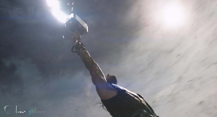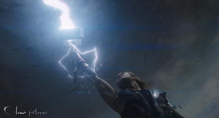 Esta fue la tercera película completa para nosotros usando el software de renderizado Arnold, y continuamos desarrollando nuestras herramientas y técnicas alrededor de este emocionante renderizado. Para acelerar el flujo de trabajo durante nuestra fase de desarrollo del aspecto, desarrollamos un sistema de captura de iluminación para ejemplos de renderizado, y modificamos la traducción de un gran número de objetos. Para las escenas de exterior, con un gran volumen de nubes, reconstruimos un sistema de construcción de nubes mejorado basándonos en los fluidos de Maya. Hubo varias escenas de Thor generando un tornado, que nos dieron la oportunidad de pulir y mejorar algunas de nuestras cosas de FumeFX y Maya.