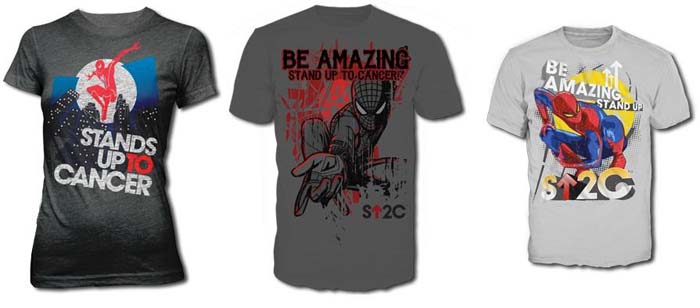Stand Up To Cancer (SU2C) se ha unido a Columbia Pictures Film y a la película The Amazing Spider-Man para ofrecer a los fans tres fantásticas camisetas, cuyos beneficios irán a parar a la fundación. Desde el pasado 18 de mayo, ya se pueden adquirir estos tres diseños exclusivos protagonizados por Spiderman junto a mensajes animando a todo el mundo a participar en contra de la enfermedad. Las camisetas se pueden comprar aquí.