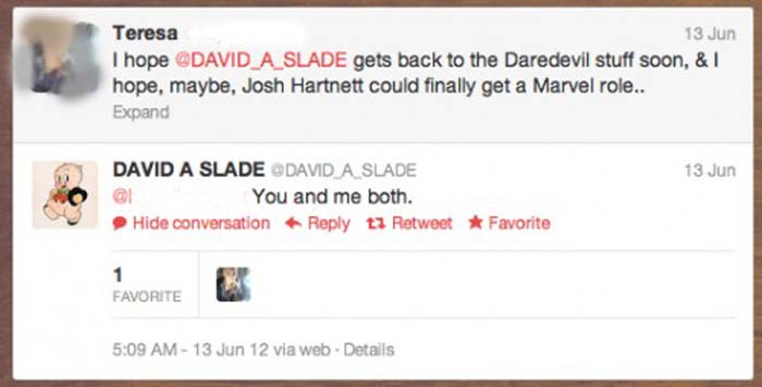 Gracias a Empire se ha podido capturar un intercambio de mensajes en Twitter entre el director de cine David Slade, que en principio dirigirá el reinicio cinematográfico de Daredevil, y un fan. Slade, que ha estado trabjando en el guión de la película junto al guionista David James Kelly inspirándose en la historia Born Again de Frank Miller, ha respondido a un par de preguntas de la siguiente forma: