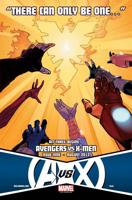 Quedando aún un par de números para que finalice el Acto Dos, Marvel ya está promocionando el Acto Tres del evento Avengers Vs. X-Men con un teaser en el que se puede leer Solo Puede Haber Uno, mientras varias manos se alzan hacia el logotipo del Fénix. ¿A quién elegirá la Fuerza Fénix?