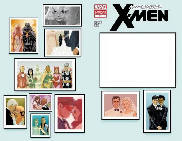 Afirmando que el cómic pide a los niños que fantaseen con su propia boda homosexual, la Asociación de Familias de Florida lamenta en su página web que el cómic posee un espacio en blanco que los niños pueden usar para dibujar su propia boda homosexual. Con esto, se refieren a la portada alternativa de Phil Noto que podéis ver a continuación, y en la que se ven hasta diez fotos de parejas homosexuales de superhéroes.