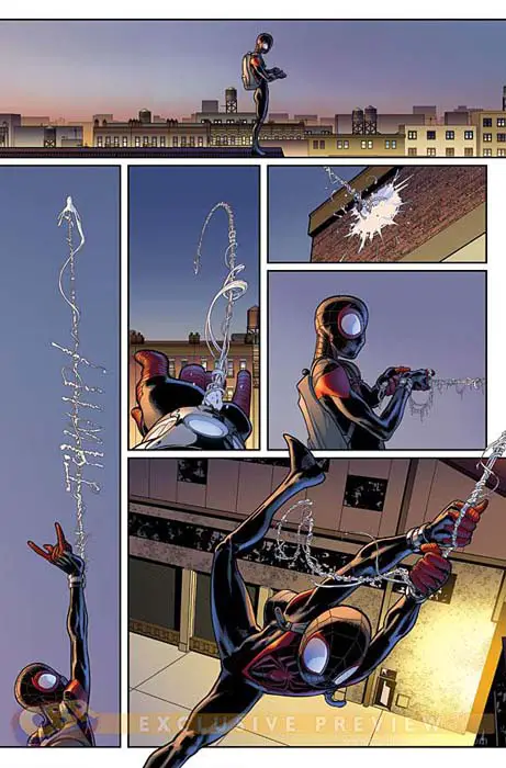 Toda esta idea surgió de Mark Bagley hace años. Una vez que pasamos nuestra primera historia en Ultimate Spider-Man, dijo, ‘He hecho Amazing Spider-Man durante años antes de estar en esta serie y este personaje es una persona diferente. Es más delgado y más joven. Tiene un nivel de energía diferente. Así que tendrá un aspecto diferente cuando haga cosas como balancearse o trepar muros. Además, por mi propia salud, no voy a dibujar lo mismo una y otra vez, usaré diferentes ángulos de cámara a los que se suelen ver en Amazing Spider-Man. Así que si echas un vistazo a esos primeros 40 números de Ultimate Spider-Man, en realidad verás siempre a Bagley buscando formas nuevas de dibujar a Spiderman, y eso es genial. Vamos a usar esa filosofía con Miles. Es una persona diferente con un físico diferente.