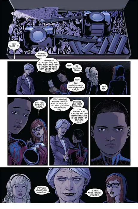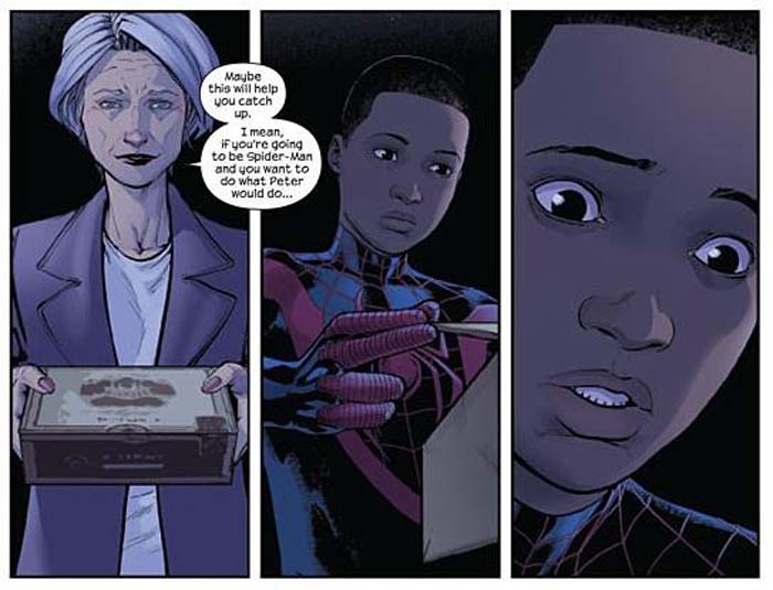 En una entrevista para CBR, el guionista Brian Michael Bendis ha hablado sobre la importancia de que Miles Morales reciba los lanzarredes de Peter Parker de mano de la Tía May en Ultimate Comics Spider-Man Nº 14. Obviamente, esto es un gran avance en el desarrollo del perosnaje, que asumió el manto de Spiderman después de que Peter muriera a manos del Duende Verde en Ultimate Comics Spider-Man Nº 160. El guionista también comenta sobre la presentación de Maria Hill en el Universo Ultimate y adelanta las próximas batallas de Miles con Veneno y otros villanos conocidos.