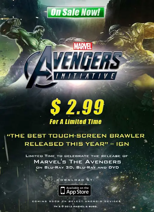Disney Online ha publicado una nota de prensa para informar de que, para celebrar el lanzamiento en DVD y Blu-ray de Los Vengadores en Estados Unidos, baja de precio por tiempo limitado del primer episodio del juego para iOS (y próximamente para Android) Avengers Initiative, que pasa de costar 5,49 € a costar 2,39 €.