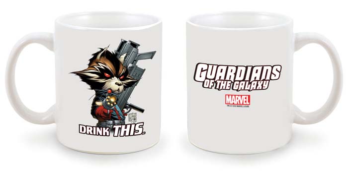 Todo el mundo quiere una buena cup o’ joe, pero algunas mañanas simplemente necesitas una bebida que no es de este mundo. Prepárate para proteger el Universo MArvel con esta taza de café edición limitada protagonizada por el personaje favorito de Los Guardianes de la Galaxia, Mapache Cohete, dibujado por el Jefe Creativo y dibujante Joe Quesada en una obra completamente nueva.
