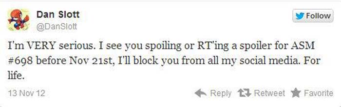 Lo digo MUY en serio. Si os veo desvelando o haciendo RT de un spoiler de ASM Nº 698 antes del 21 de noviembre, os bloquearé de todas mis redes sociales. Para siempre.