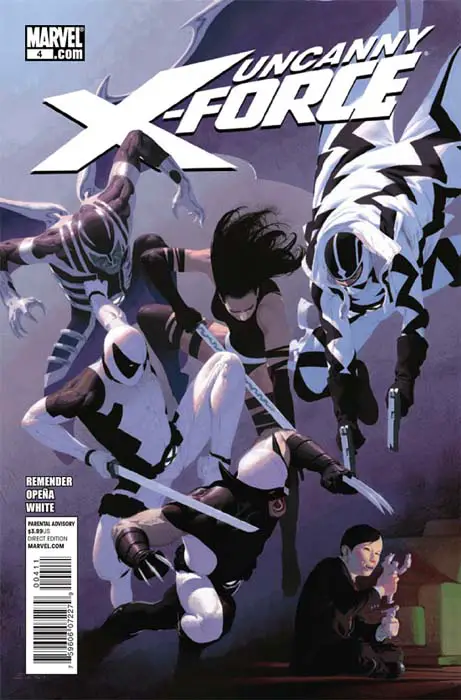 A pesar de su intermitencia, pienso que Rick Remender es un gran guionista, quizá no genial, pero sí brillante. Cumple a la perfección ese papel de buen escritor que se ve engrandecido por la necesidad de su público de escritores estelares. Sus guiones para Imposibles X-Force rebosan originalidad, momentos chocantes y diálogos ingeniosos. Maneja con inteligencia los personajes de los que dispone y aunque parezca casi imposible, ha logrado ordenar y expandir los conceptos mas bizarros (sí, puristas, estoy usando el anglicismo) que lanzó Grant Morrison en su larga etapa con los X-Men. Incluso ha conseguido dotar de fondo y protagonismo al detestable Fantomex, aunque a mí en particular me sigue pareciendo odioso y asesinable. Además, Remender renueva con acierto el clásico culebrón marveliano, explotando el triángulo amoroso superheroico en esa tradición que fue inmortalizada antes en etápas clásicas de Los Vengadores, La Patrulla X y Spiderman, y nos dejó enormes momentos con androides, brujas, humanos energizados muertos y resucitados, pequeños mutantes con garras y mala leche, chicas pelirrojas capaces de hacer flotar el mundo, rígidos de un ojo rojo, reporteros, secretarias, modelos y niñas buenas de pelo rubio y liso. En este caso el triángulo gira en torno al alado, a la bruja psíquica-ninja-buenorra y al insoportable de blanco, buceando con elegancia en los procelosos mares del amor: la pasión, la amistad y la manipulación psicológica.
