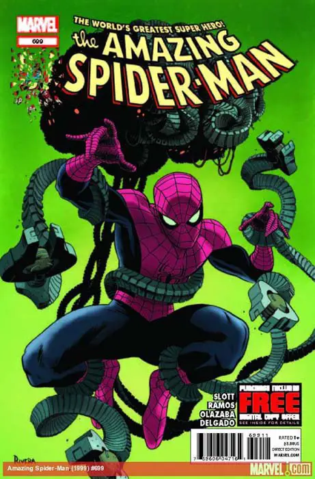 Ya se han filtrado escaneos de Amazing Spider-Man Nº 698, y aunque aquí no os los vamos a mostrar para no desvelar nada importante de esta gran historia, sí que os vamos a mostrar la portada del número 699 que acaba de revelar Marvel, obra de Paolo Rivera, que posiblemente muestra un adelanto de lo que podrían esperar los fans a partir de este miércoles. En realidad, no consideramos que la portada sea un spoiler, pero también creemos que queda un poco sujeto a la interpretación del lector, así que la dejamos después del salto.