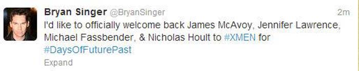 Me gustaría dar de nuevo la bienvenida oficialmente a James McAvoy, Jennifer Lawrence, Michael Fassbender, Nicholas Hoult a los #XMEN para #DaysOfFuturePast.