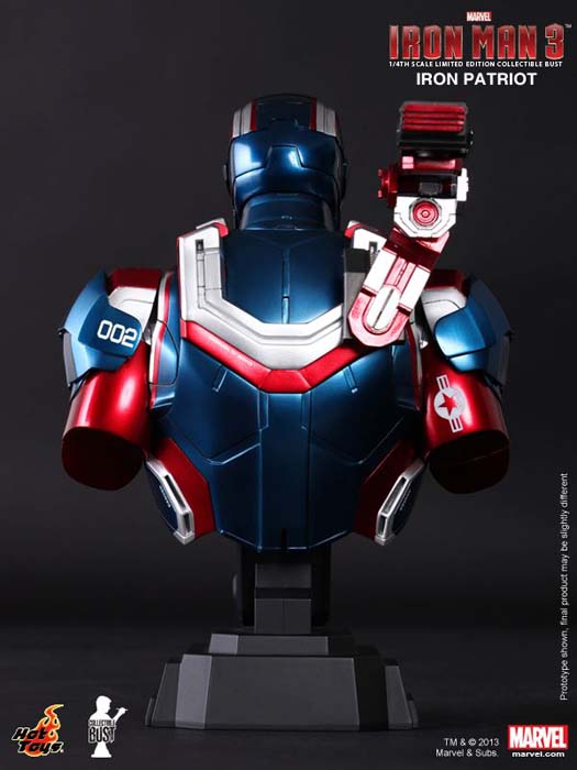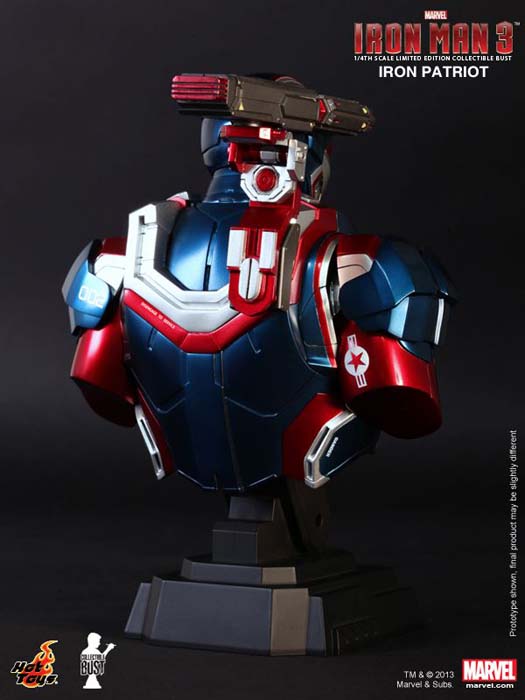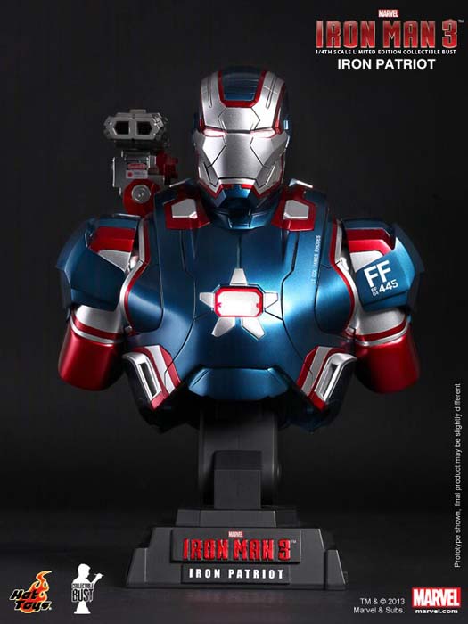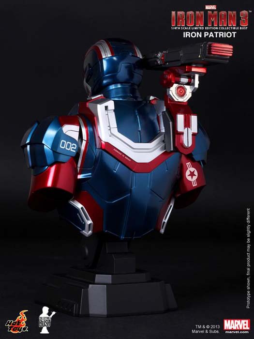 La película presentará a un nuevo personaje llamado Iron Patriot, que viene bien dotado de fuerza militar y superioridad tecnológica transformando la armadura de Máquina de Guerra. Hot Toys se enorgullece de presentar el Iron Patriot Limited Edition Collectible Bust de escala 1/4, que es producido en una escultura especialmente basándose en la imagen del personaje Iron Patriot de la película, destacando las funciones de luz y el arma del hombre rotativa.