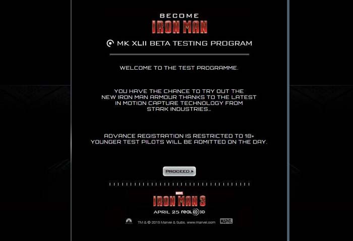 Hubo muchas especulaciones sobre qué sería la web viral BecomeIronMan.com de Iron Man 3 cuando se lanzó hace un par de meses, y parece que no se trata de nada más de lo que su propio nombre indica. Según se puede ver ya en la web, esta iniciativa permitirá a los fans ponerse el traje de Iron Man, eso sí, a través de tecnología de captura de movimientos. De momento parece que solo hay posibilidad para localizaciones en el Reino Unido, pero esperamos que esta iniciativa llegue también a España.