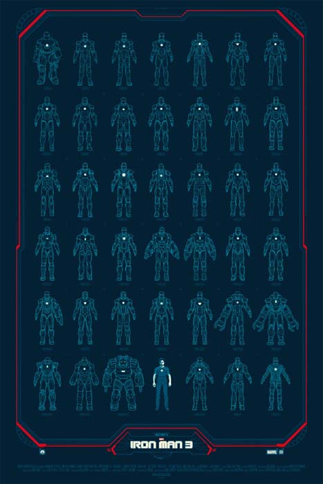 Como no podía ser de otra forma, Mondo ha lanzado dos nuevos pósters basados en Iron Man 3. Como siempre, no será fácil hacerse con ellos, ya son ediciones limitadas que saldrán a la venta a una hora aleatoria del próximo viernes a través de su cuenta de Twitter. El primero de ellos ha sido dibujado por Martin Ansin, y se pondrán a la venta 450 ejemplares de la versión normal a 50 dólares y 200 ejemplares de la versión alternativa a 75 dólares. El otro póster es un póster especial que brilla en la oscuridad realizado por Phantom City Creative, limitado tan solo a 250 unidades a 45 dólares.