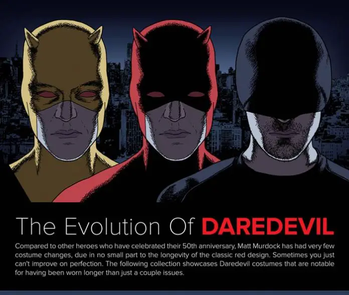 Desde esta web, nos llega una infografía que muestra cómo ha ido cambiando el traje del Hombre Sin Miedo a lo largo de sus 51 años.